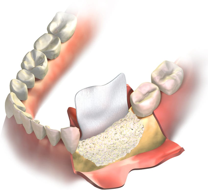 Če zob ali zobje že nekaj časa manjkajo, bo zobozdravnik na prizadetem mestu naredil majhen rez, pripravil površino kosti in nanjo namestil drobce iz drugega dela čeljusti skupaj z zrnci hidroksiapatita ali, pogosteje, samo apatit. Presadek se pritrdi z membrano, nato pa se zašije.